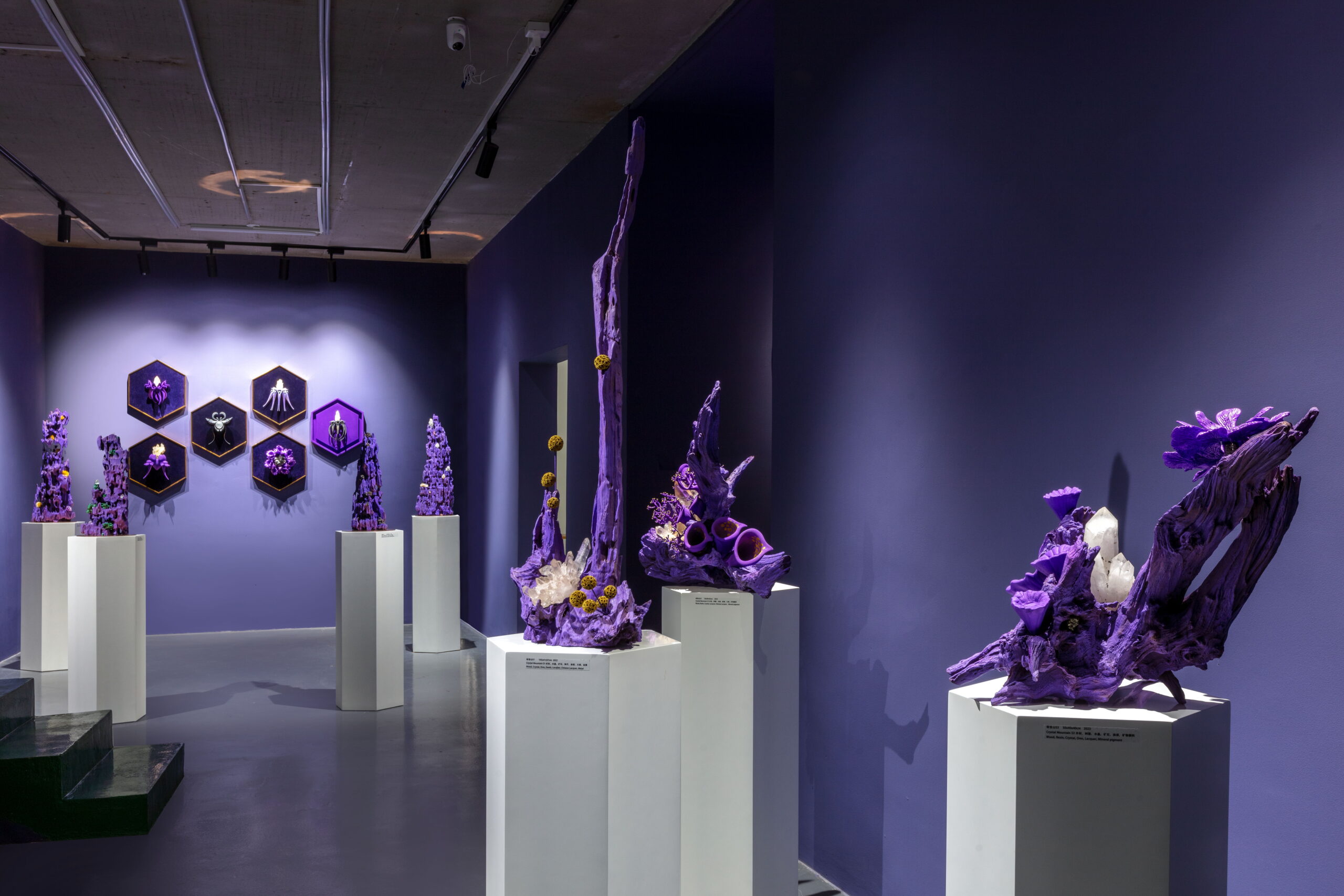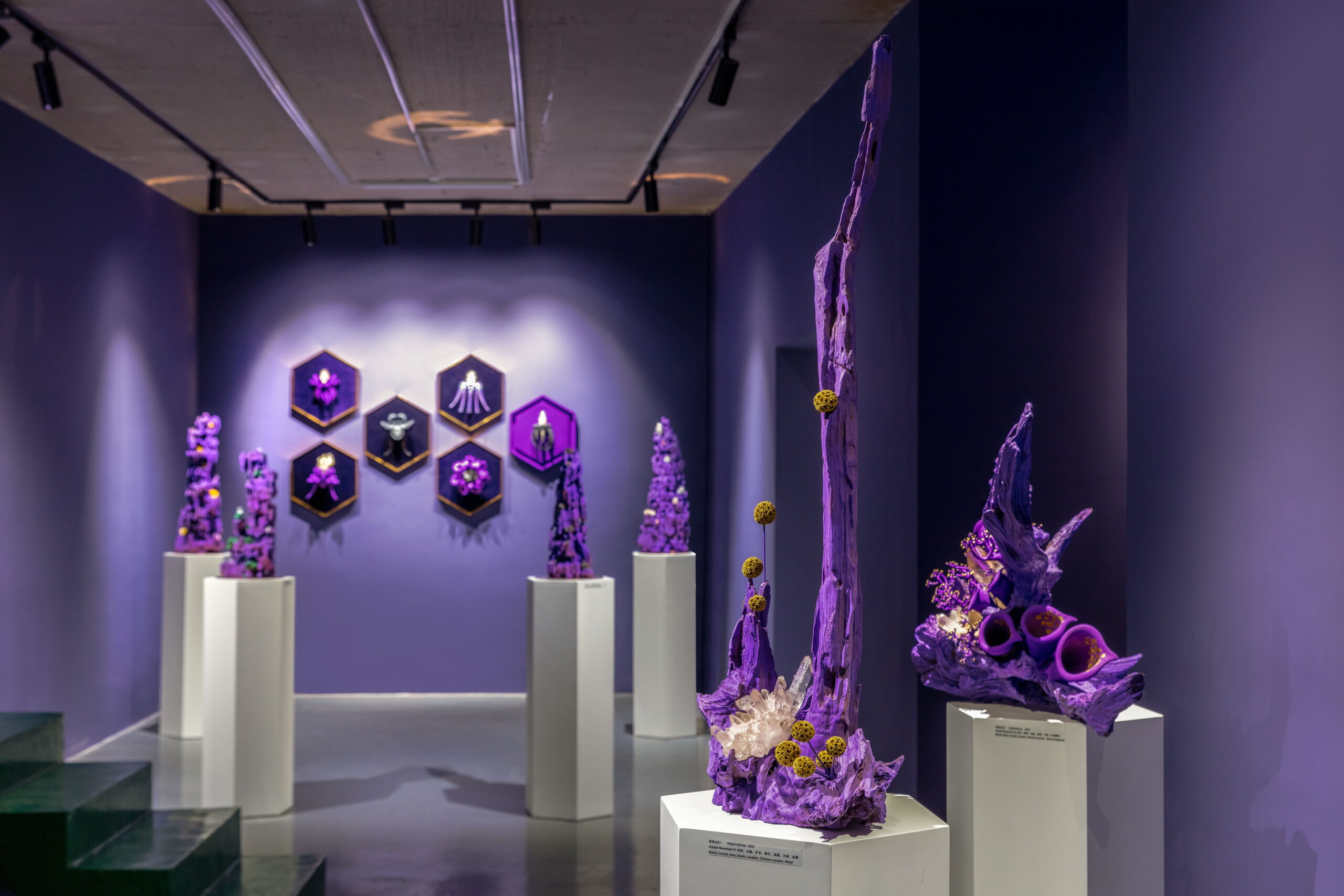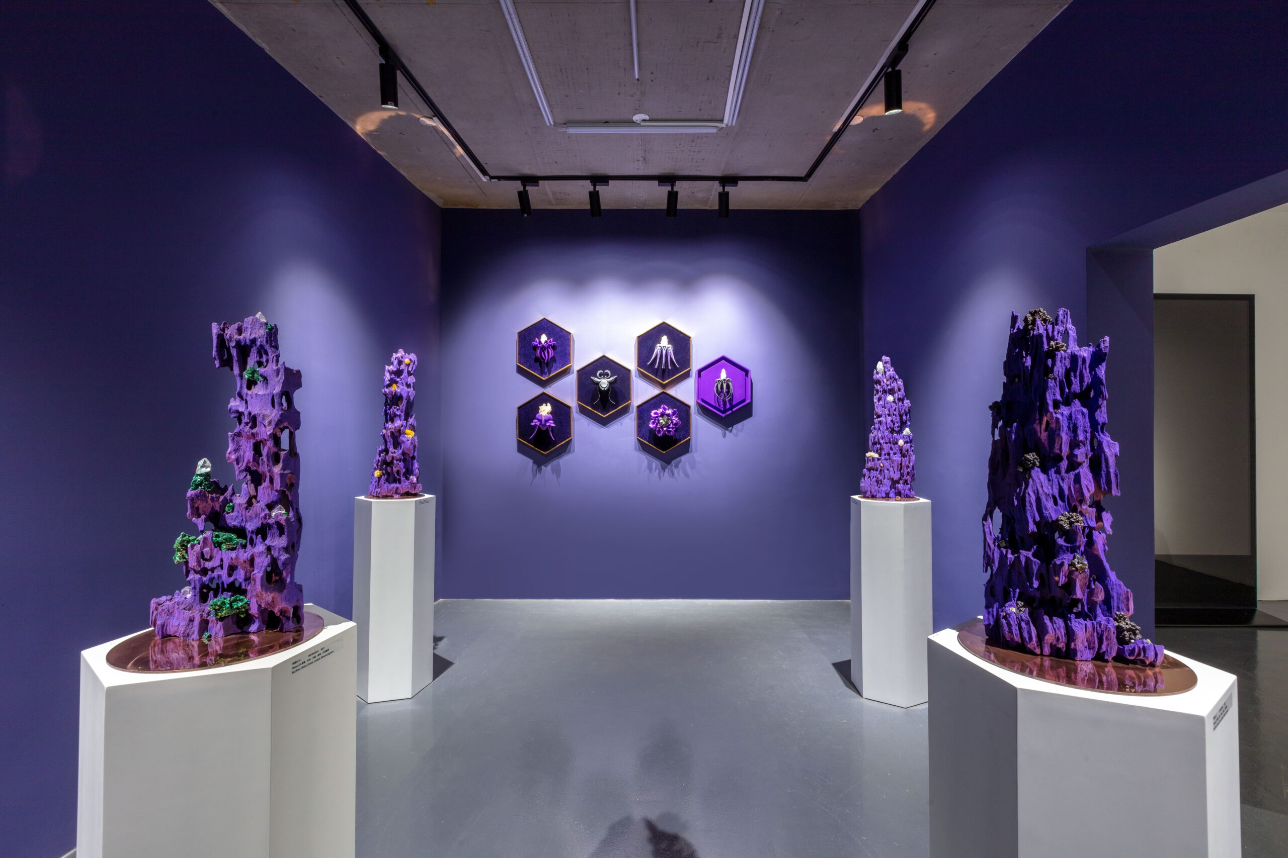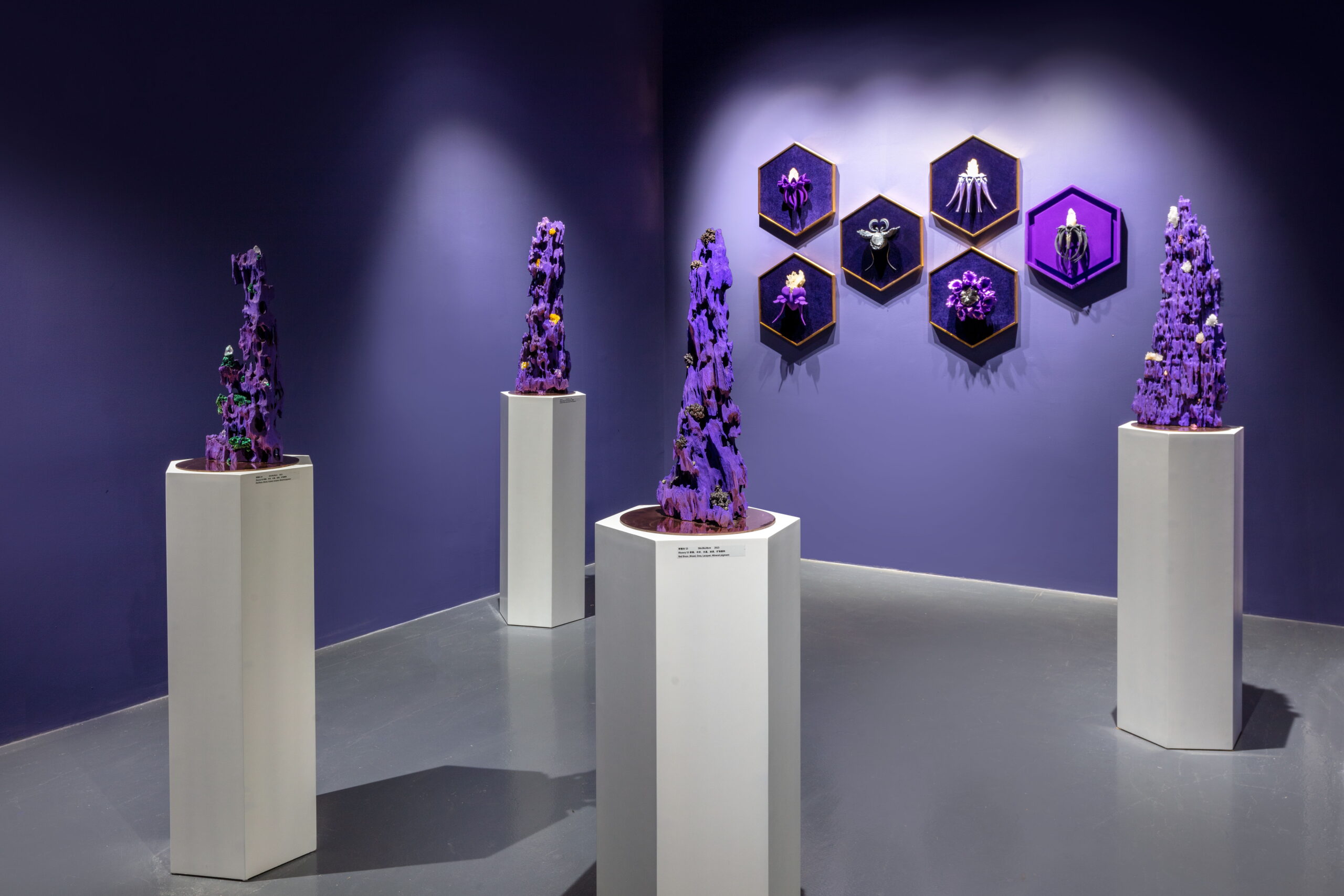 今天的世界,科技与自然并存,全球化与民族主义并存,文化艺术也在这一多元的背景下呈现出多维发展。AA创造的梦幻,柔软,亦是坚硬的紫色星球便诞生在3年全球疫情期间,一个充满不确定性与挑战的历史阶段。从信息的大众传播到互联网造就的信息茧房,从全球化到去全球化,开放和危机为新一代的艺术家提供了特别的土壤,而科技,尤其是以数字技术为主的一系列工具为跨学科思维与创造提供了更为直接的源动力,丰富了艺术创作的视角。AA就是一位跨界而来,带着使命,温雅、纯粹却充满力量的艺术家。她通过一系列数字技术手段的支持,将天然矿晶所代表的无机体与木材所代表的有机体并置,并借用VR技术打造了一个奇异生物共生的紫色星球。
