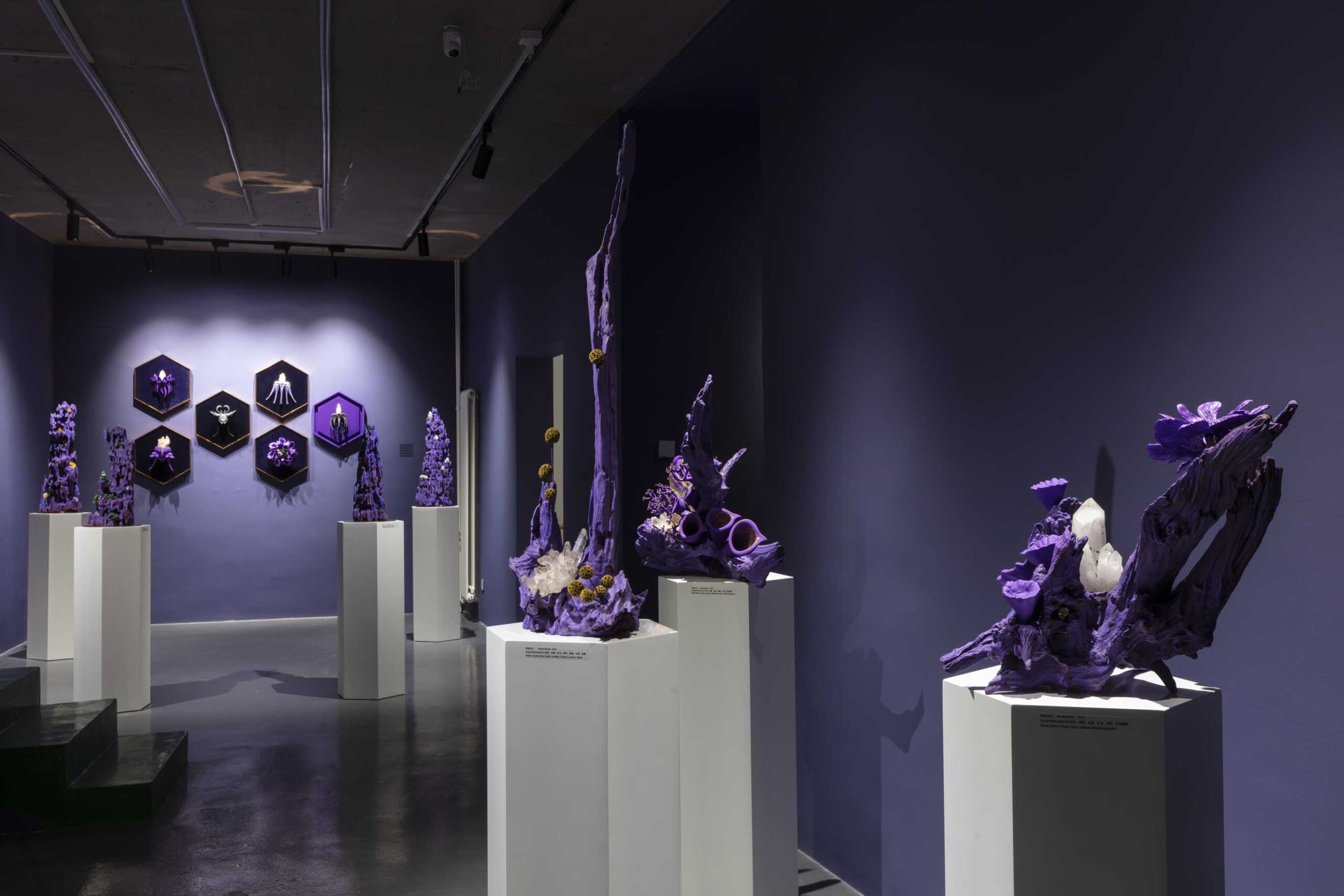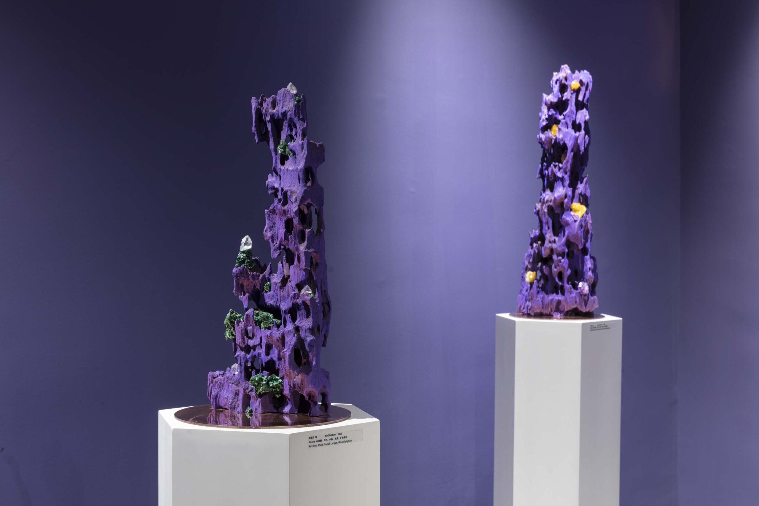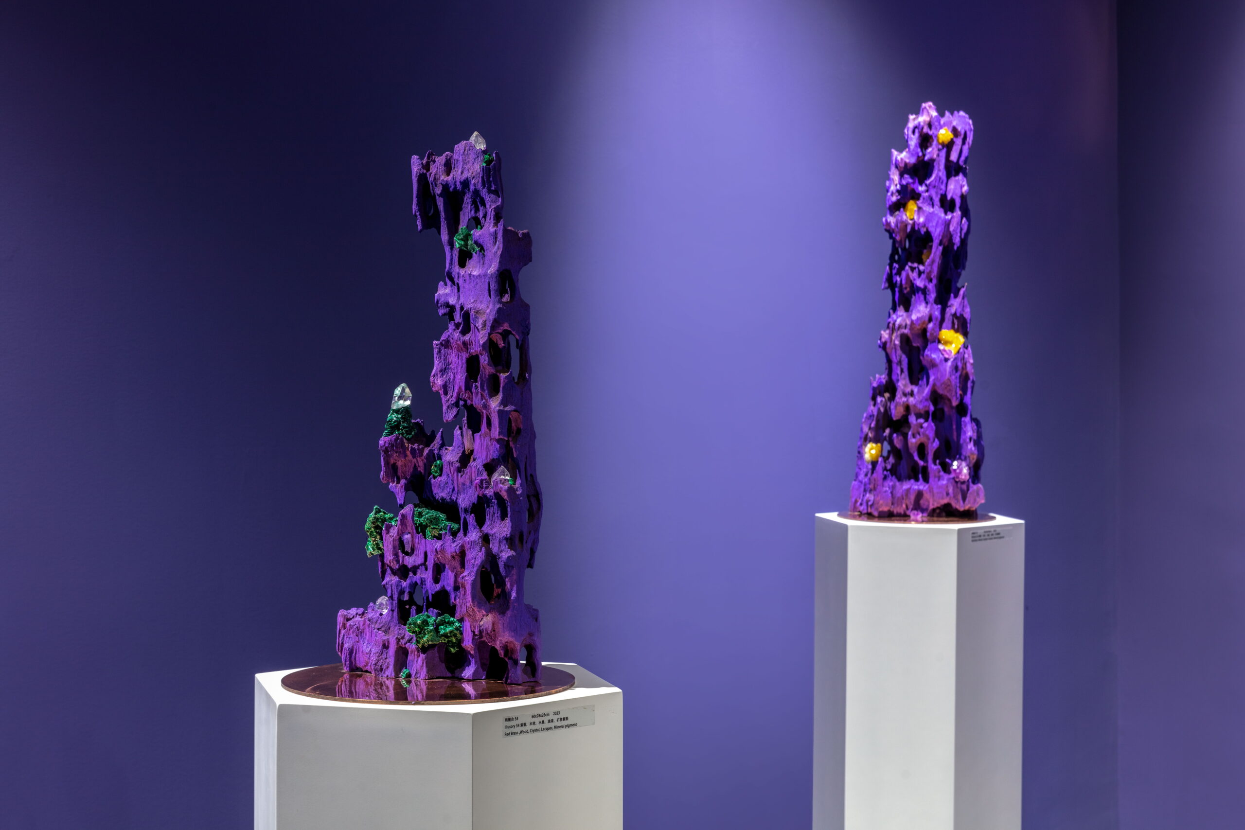 今天的世界,科技与自然并存,全球化与民族主义并存,文化艺术也在这一多元的背景下呈现出多维发展。AA创造的梦幻,柔软,亦是坚硬的紫色星球便诞生在3年全球疫情期间,一个充满不确定性与挑战的历史阶段。从信息的大众传播到互联网造就的信息茧房,从全球化到去全球化,开放和危机为新一代的艺术家提供了特别的土壤,而科技,尤其是以数字技术为主的一系列工具为跨学科思维与创造提供了更为直接的源动力,丰富了艺术创作的视角。AA就是一位跨界而来,带着使命,温雅、纯粹却充满力量的艺术家。她通过一系列数字技术手段的支持,将天然矿晶所代表的无机体与木材所代表的有机体并置,并借用VR技术打造了一个奇异生物共生的紫色星球。