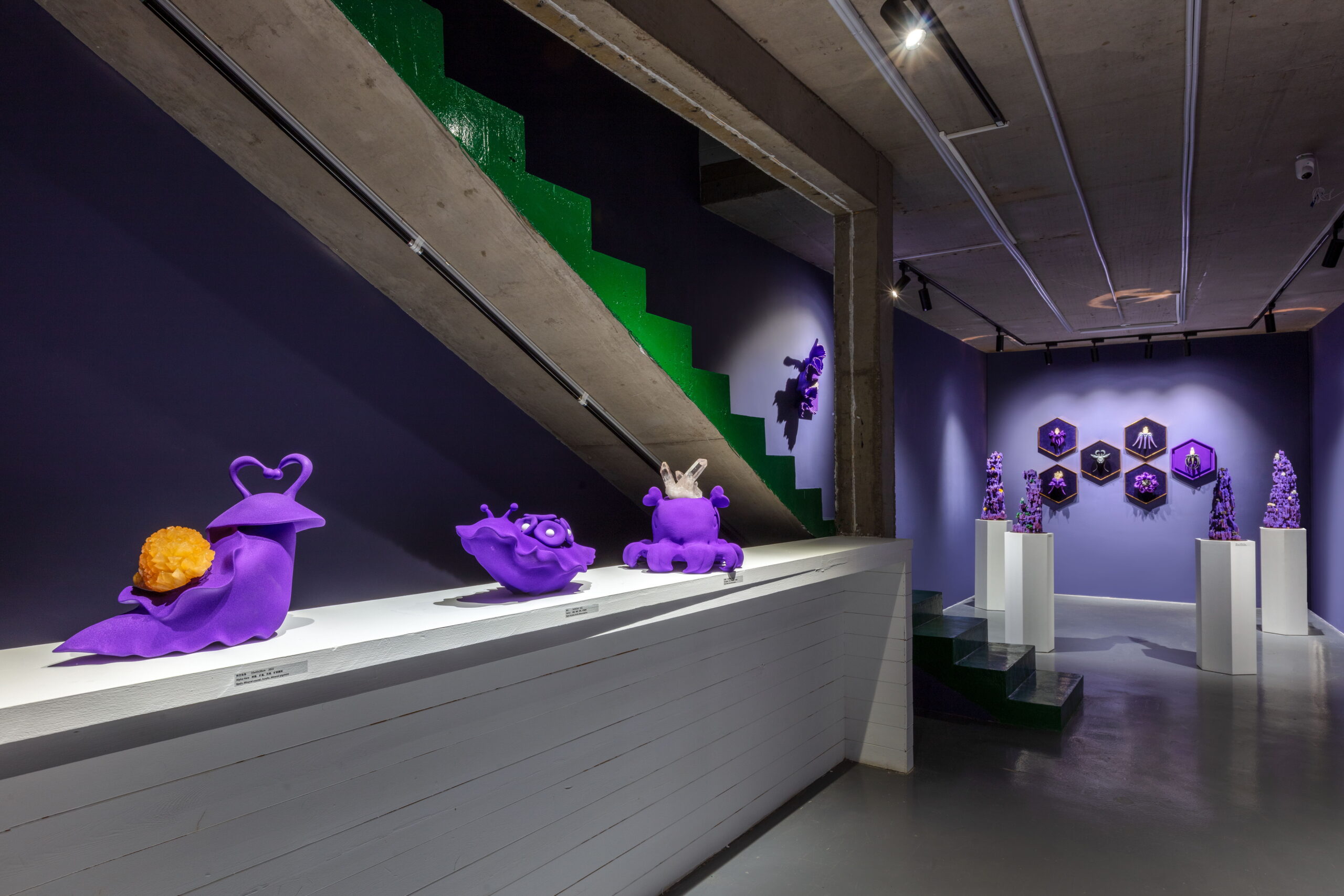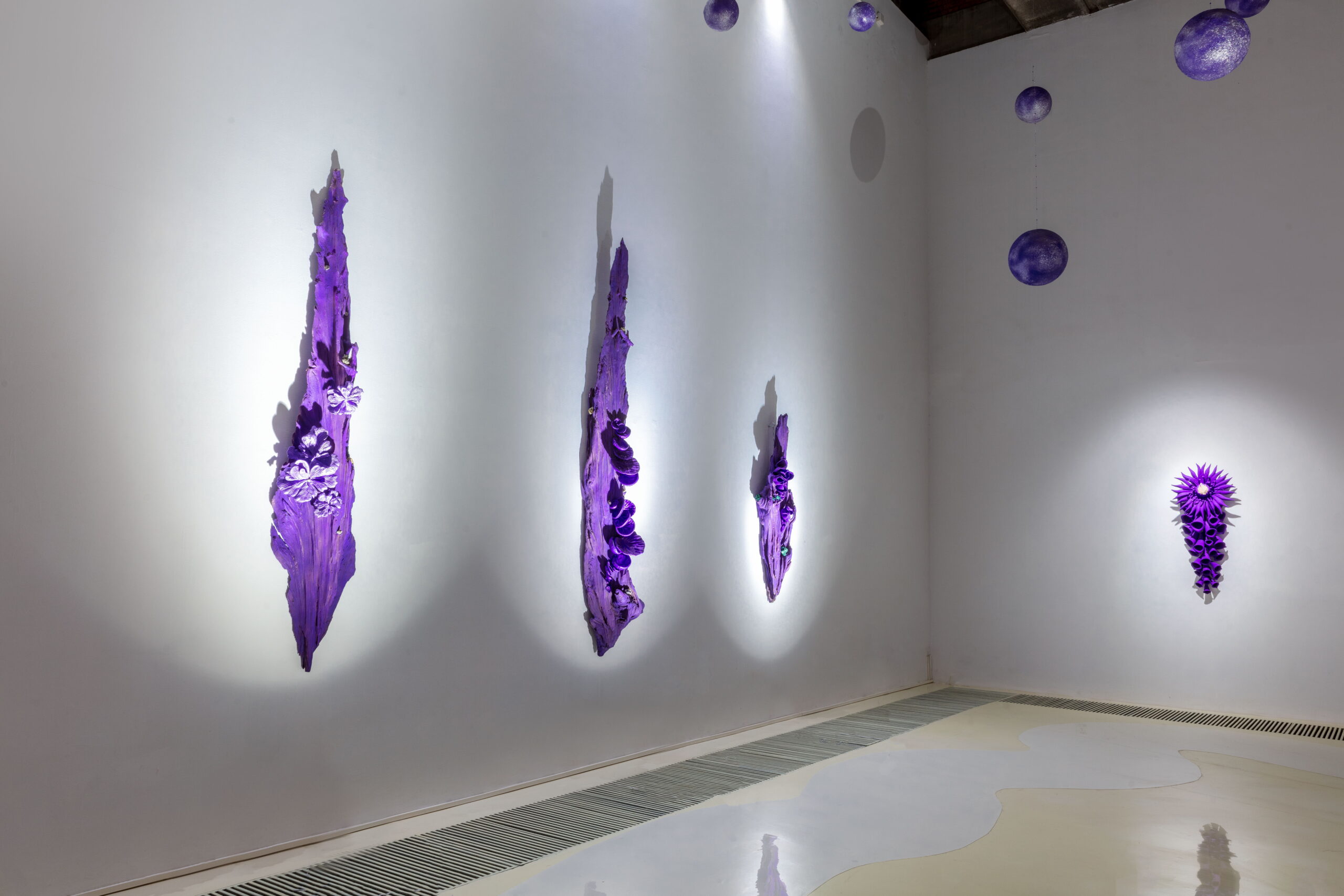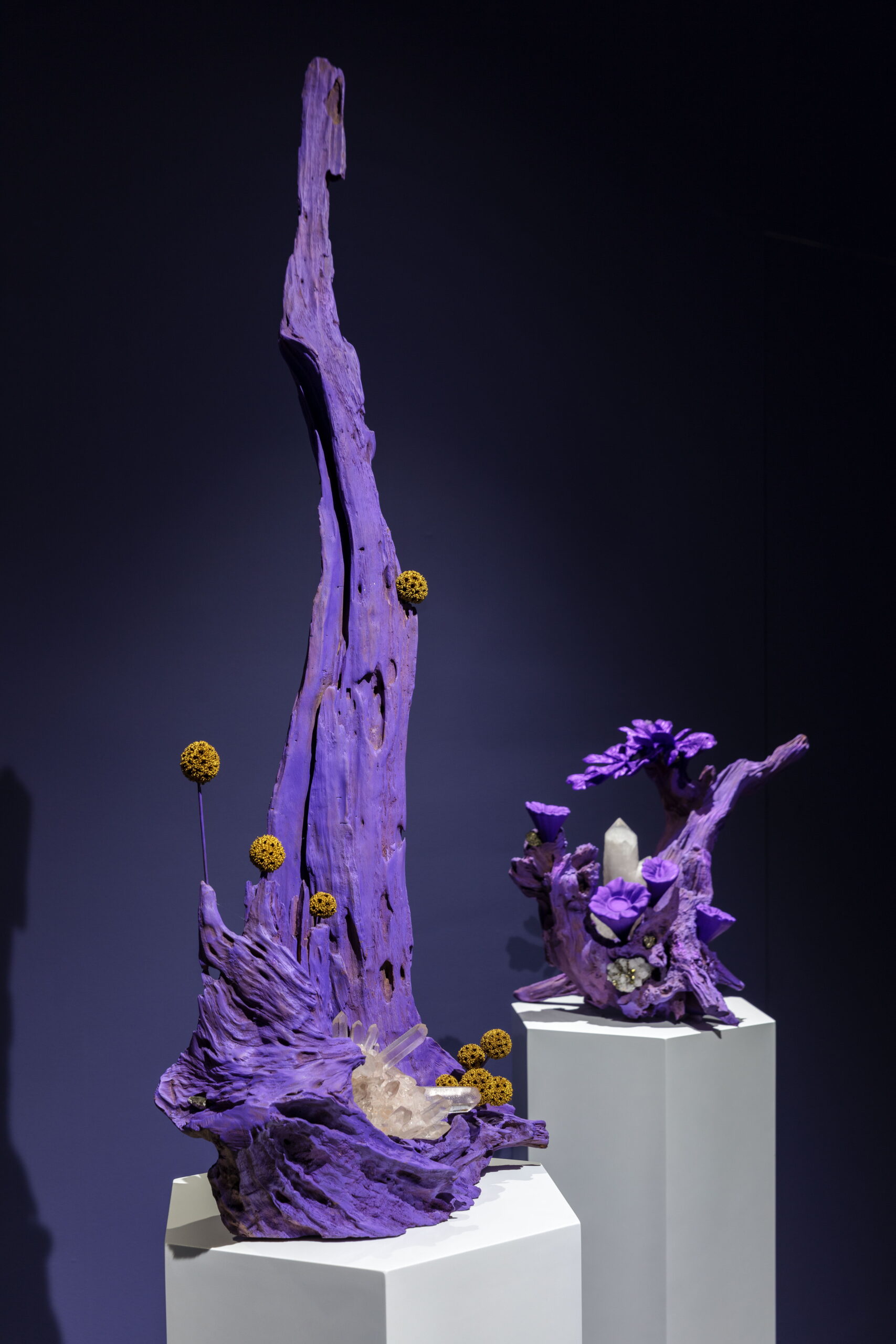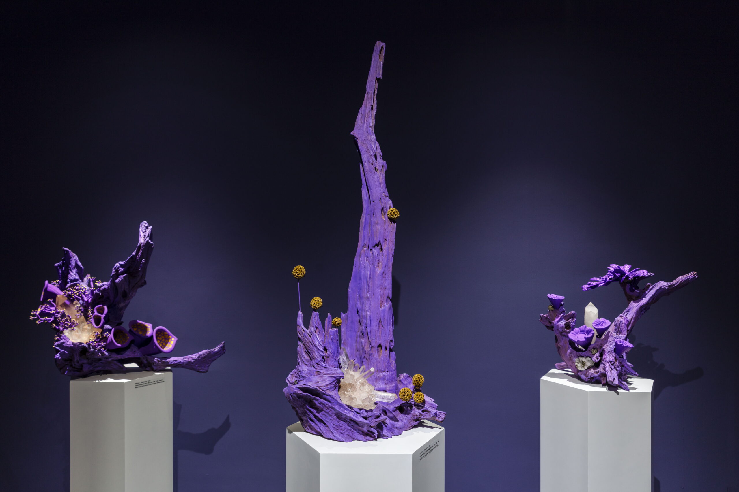 今天的世界,科技与自然并存,全球化与民族主义并存,文化艺术也在这一多元的背景下呈现出多维发展。AA创造的梦幻,柔软,亦是坚硬的紫色星球便诞生在3年全球疫情期间,一个充满不确定性与挑战的历史阶段。从信息的大众传播到互联网造就的信息茧房,从全球化到去全球化,开放和危机为新一代的艺术家提供了特别的土壤,而科技,尤其是以数字技术为主的一系列工具为跨学科思维与创造提供了更为直接的源动力,丰富了艺术创作的视角。AA就是一位跨界而来,带着使命,温雅、纯粹却充满力量的艺术家。她通过一系列数字技术手段的支持,将天然矿晶所代表的无机体与木材所代表的有机体并置,并借用VR技术打造了一个奇异生物共生的紫色星球。