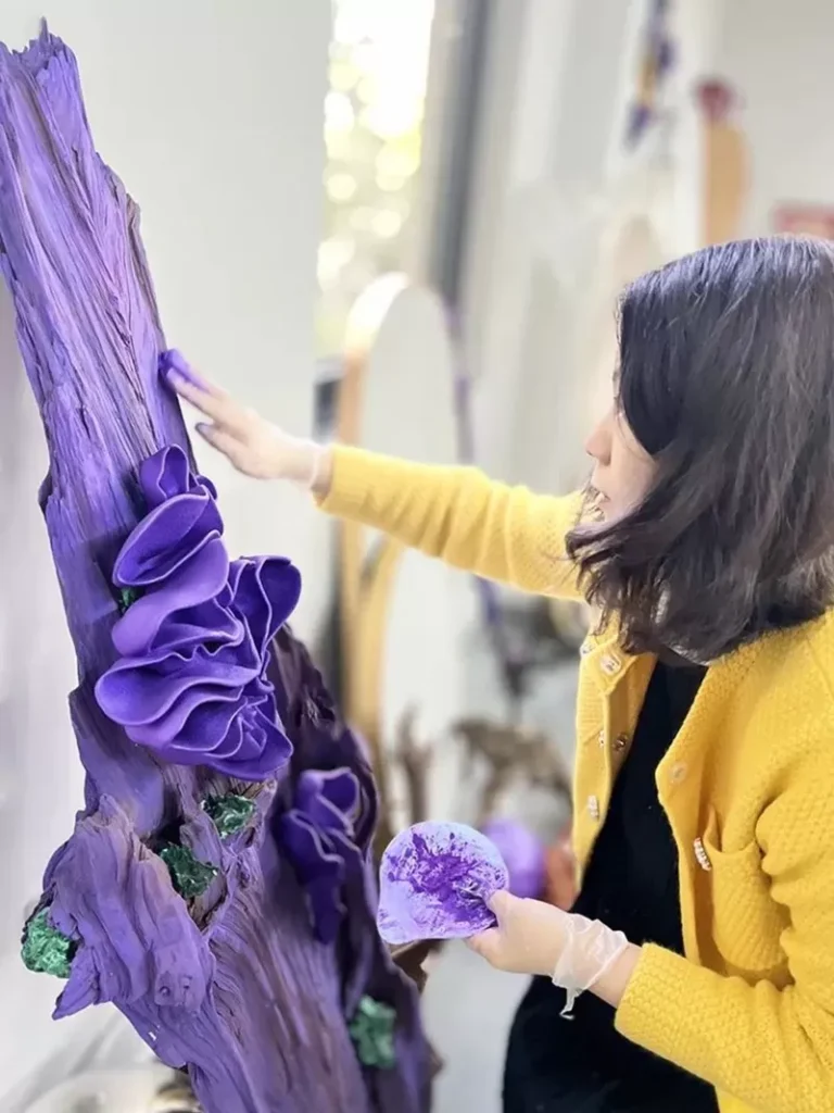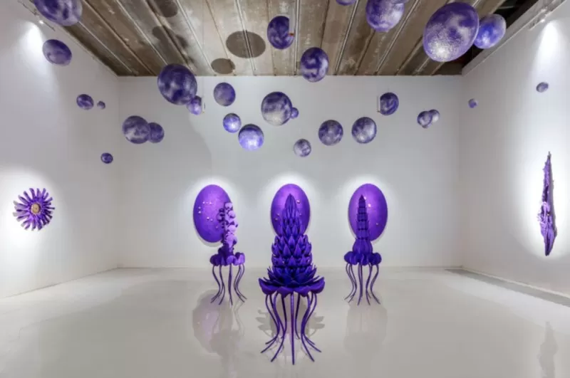 用天然矿晶、木材、标志性紫色等创造了实体艺术作品的同时,也用VR、AR 等技术创建了一个虚拟的元宇宙紫色星球。她的作品跨越时间与空间,展现艺术家对世界与宇宙的探索与热爱。