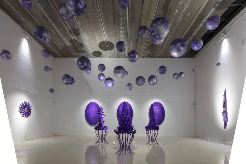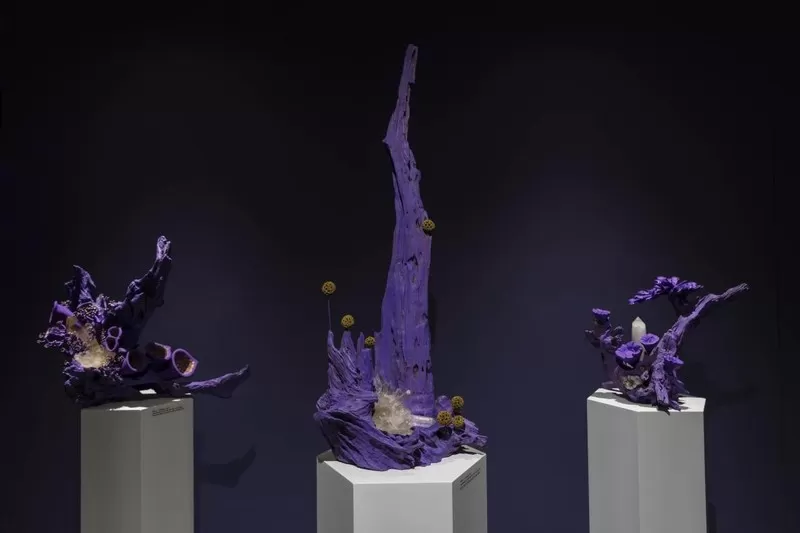 紫色星球个展的作品的核心思想是创造一个乌托邦式的精神世界,一个充满美好和想象力的奇幻宇宙。曹雅薇通过将自然之物如水晶矿石、木头等融入作品,并以紫色为基调,将她对紫色的理解与自我精神世界相结合。紫色作为一个具有多样性和变化性的颜色,不仅传达着温馨、梦幻的感觉,还带来了权威感和神秘感。曹雅薇的作品通过运用紫色的不同变化,展示了她作为艺术家的实力和对艺术的独特见解。